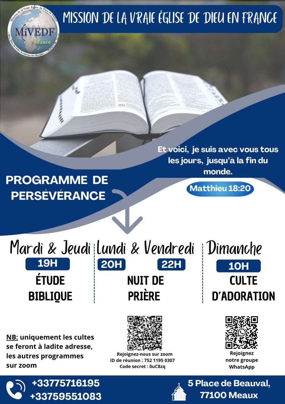 La Mission de la Vraie Eglise de DIEU en France (MiVED France) est une association religieuse déclarée officiellement ne préfecture de Seine-et-Marne. Son siège se situe à Bussières dans le 77.